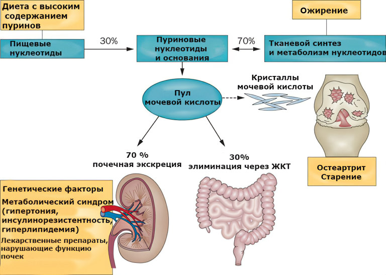 Пурины — ключевые элементы аминокислот, из которых формируются молекулы ДНК. В процессе пуринового обмена в организме образуется мочевая кислота. При разрушении клеток происходит распад пуриновых оснований. Продукты этого распада попадают в печень через кровоток, где под действием ферментов преобразуются в кристаллы мочевой кислоты.
