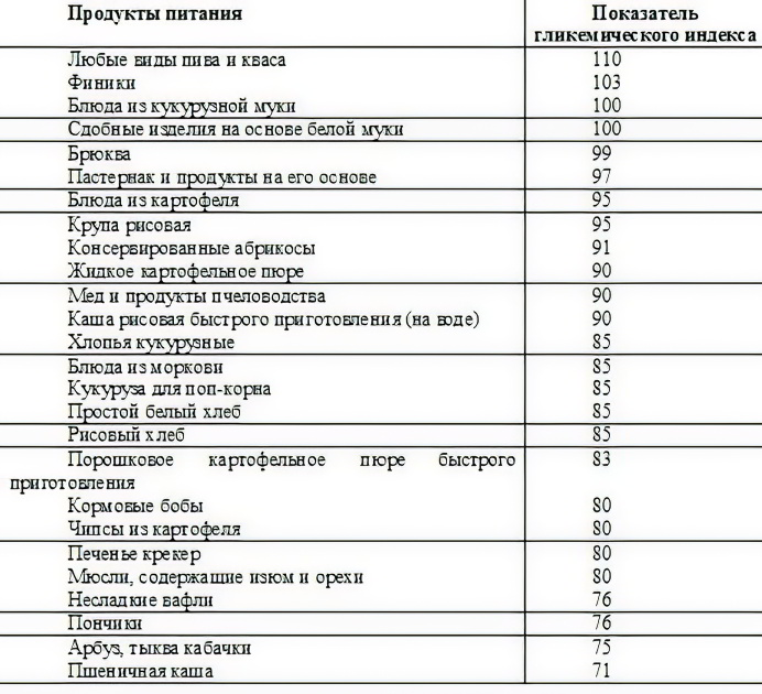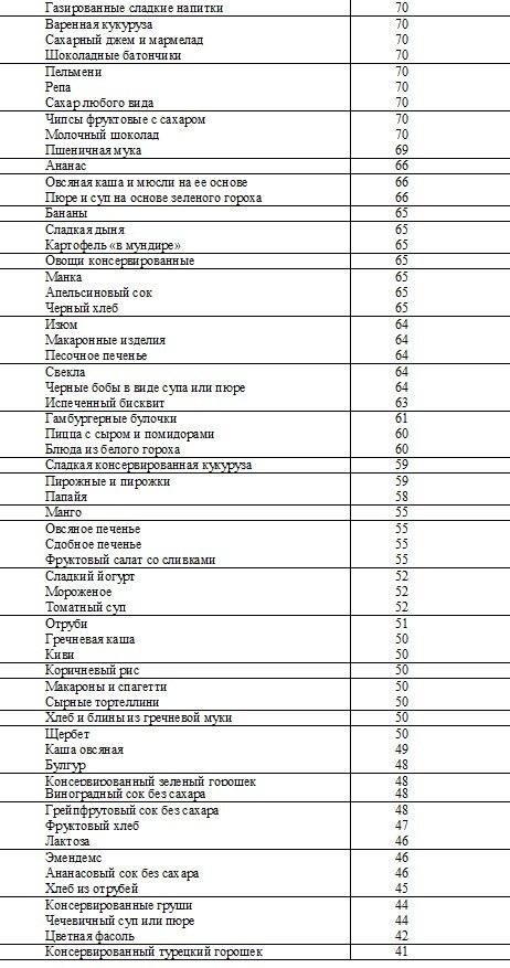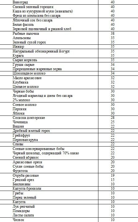 Таблица (список) продуктов с высоким и низким гликемическим индексом