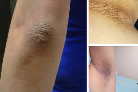 Акантоз нигриканс (потемнение и утолщение кожи в складках) | Инсулинорезистентность, нарушение обмена веществ | Лечение основного заболевания (инсулинорезистентности), улучшение контроля уровня сахара в крови |