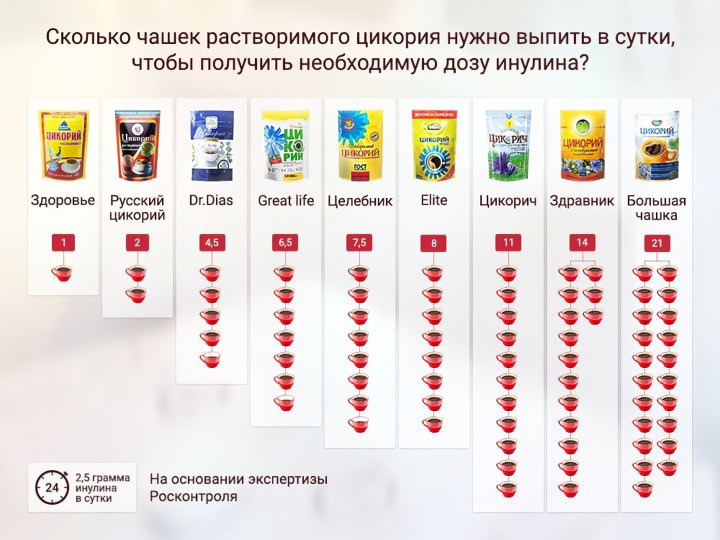 Каково содержание инулина в растворимом цикории? Это зависит от производителя: например, цикорий марки «Здоровье» содержит 54,5% инулина, в то время как у продукта «Большая чашка» его содержание минимально — всего 3%.